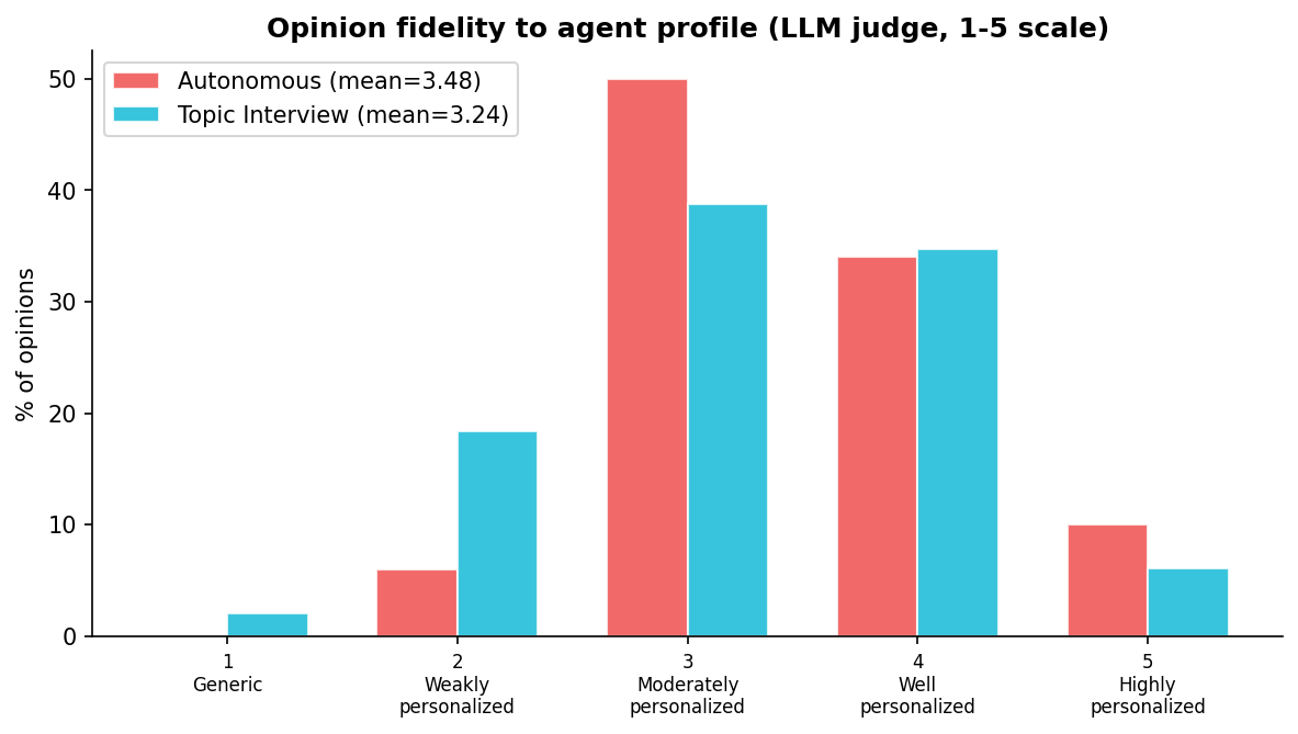 Autonomous opinions scored 3.48 (moderately-to-well personalized) vs topic interviews at 3.24 — the difference is not significant ($p = 0.88$). Both sources reference profile elements at similar rates. Zero percent of autonomous opinions were flagged as using "no profile elements."