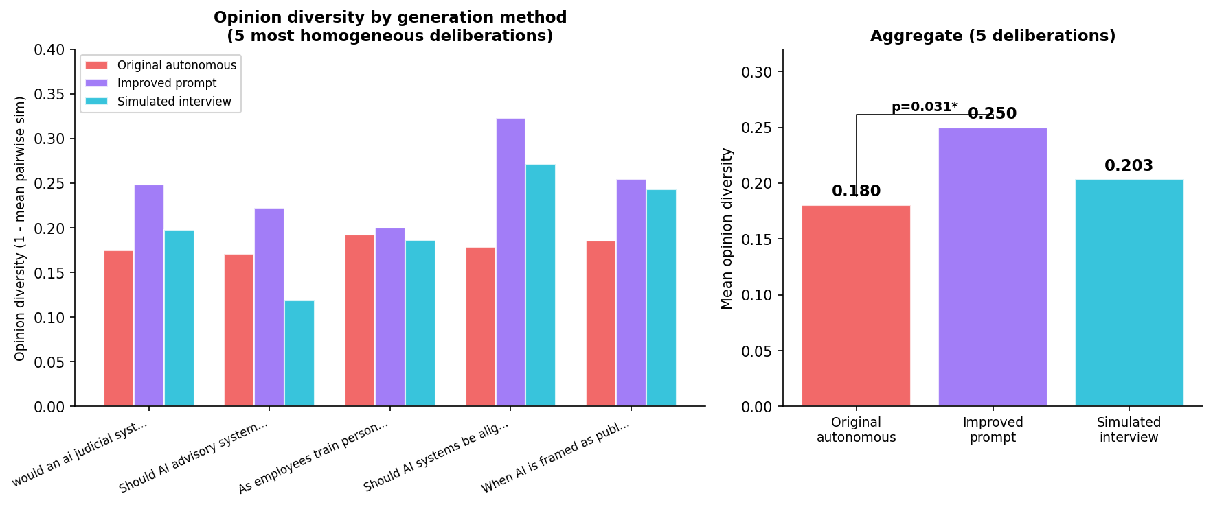 The improved prompt produces 39% more diverse opinions than the original ($p = 0.031$). The simulated interview produces only 13% more ($p = 0.22$, not significant).