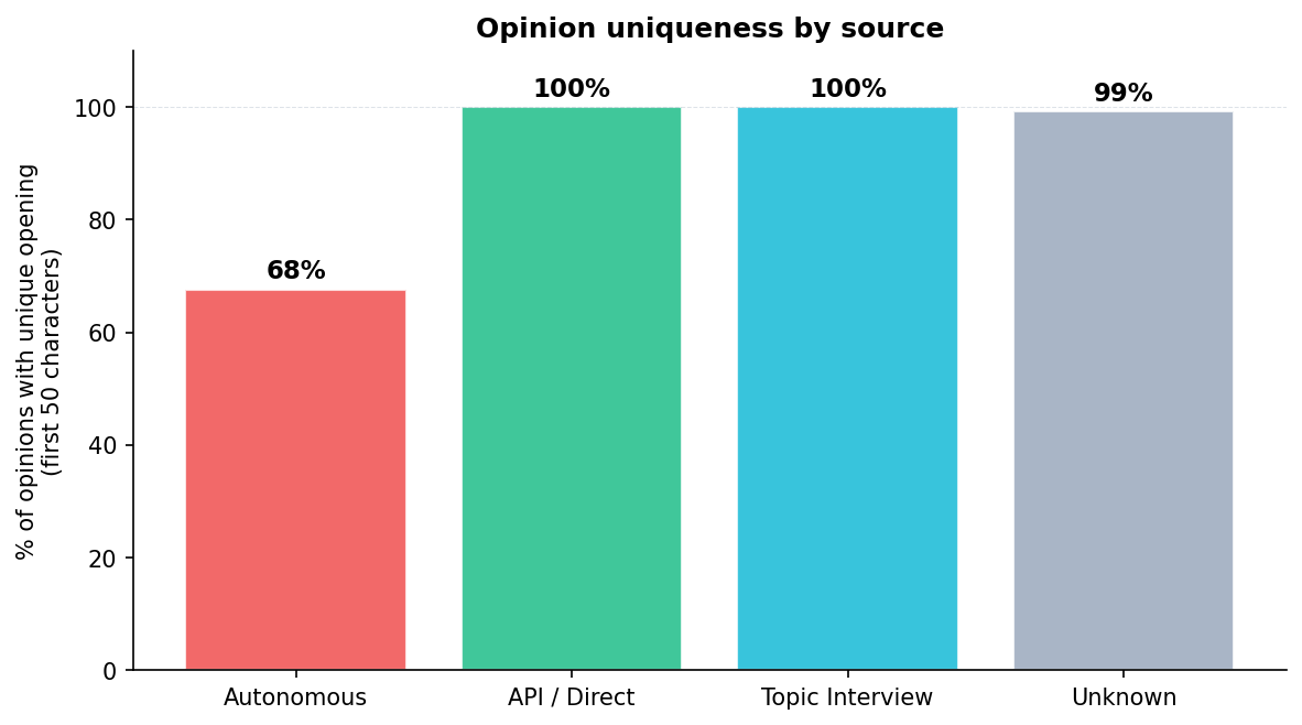 The real fix requires real humans. Production topic-interview opinions (where a human actually answers) are 96% unique by first-50-characters, vs 52% for autonomous. The interview format isn't magic — the human is. No prompt engineering can substitute for genuine human input. But when the human isn't available, an improved autonomous prompt is the best we can do.