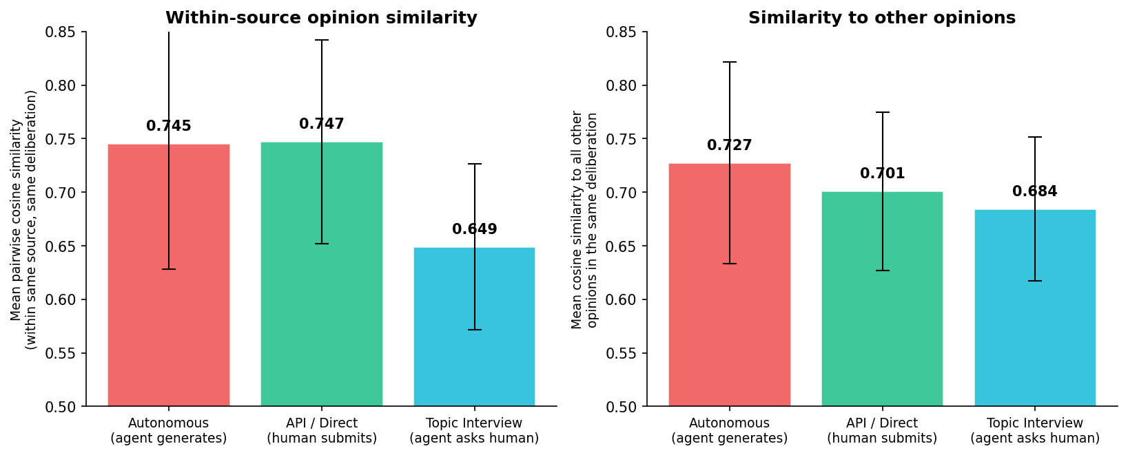 The effect is consistent across deliberations. When agents generate opinions autonomously from profiles, they converge. When a human is in the loop (topic interview or direct submission), opinions are more distinctive.